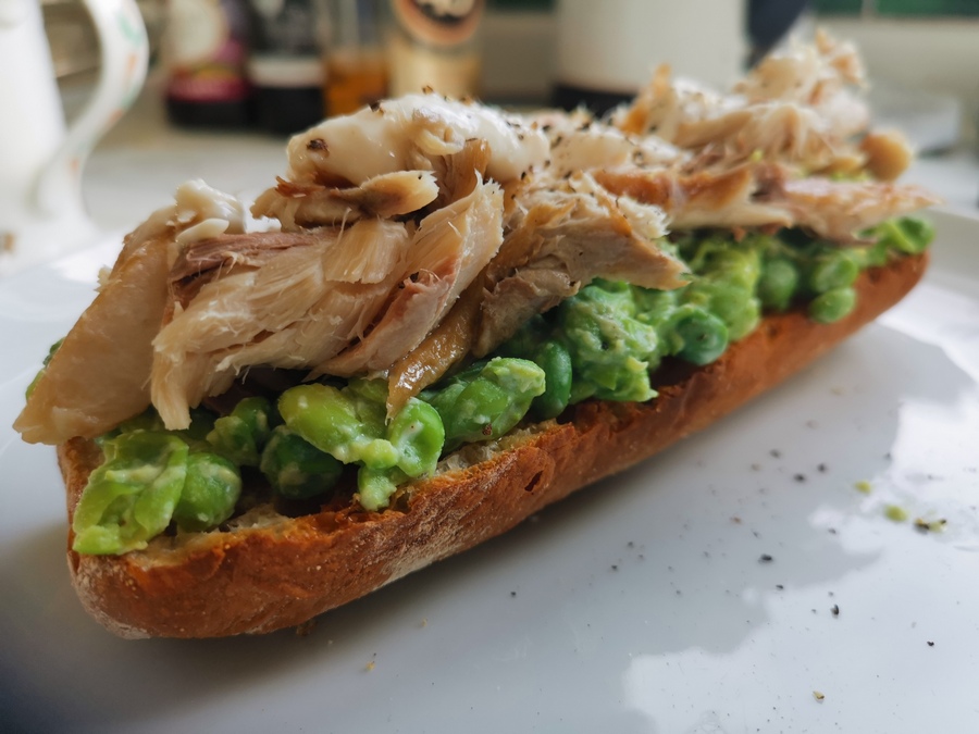 Warm Ciabatta Toast, with a sprinkling of Extra Virgin Olive Oil, crushed garden peas (minted), flaked smoked mackerel dressed in horseradish. Cracked black pepper seasoning. What could be more simple? Packed with protein, heart-healthy and brain-boosting omega-3 fatty acids, as well as minerals and vitamins, smoked mackerel is a terrific fish to include in your diet. Omega-3 is a good fat found in oily fish and plays an essential role in keeping the heart healthy while aiding brain function and development.